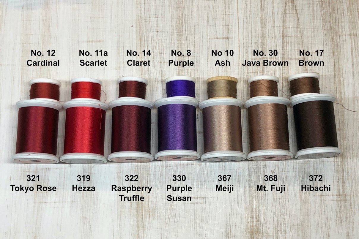 Just some numbers I've worked out for Kimono and Pearsall's. There are also some other colors of Kimono that I really like that are not available in Pearsall's. I started tying with the Kimono when Pearsall's fell. I really like it. It is smaller in diameter to Pearsall's which is great for those #16-#20's. Mind you, my normal tying thread is Griffith's 14/0 so this feels very comfortable to me. I've had no breakage issues with the Kimono silk. It has some great colors that are damn close to Pearsall's. It's hard to photograph and compare side by side because the diameter difference does effect the photography. the biggest downside to the Kimono is the large spools. They won't fit a standard bobbin holder you will need to manipulate a large bobbin holder to make them fit. Anyway this may save some time if you want to try some.