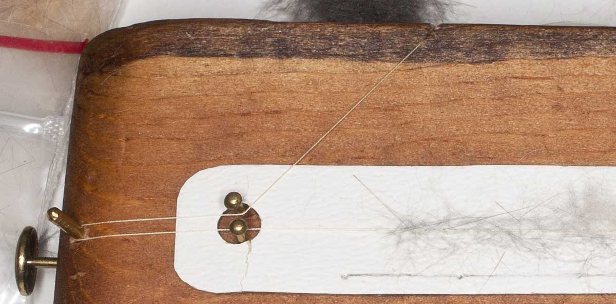 Lay the other half of the silk over your carfully-placed dubbing and secure it in the notch with the other end of the thread. Note the little cutting blade that Pete inset into end of the block for cutting thread to the correct length.