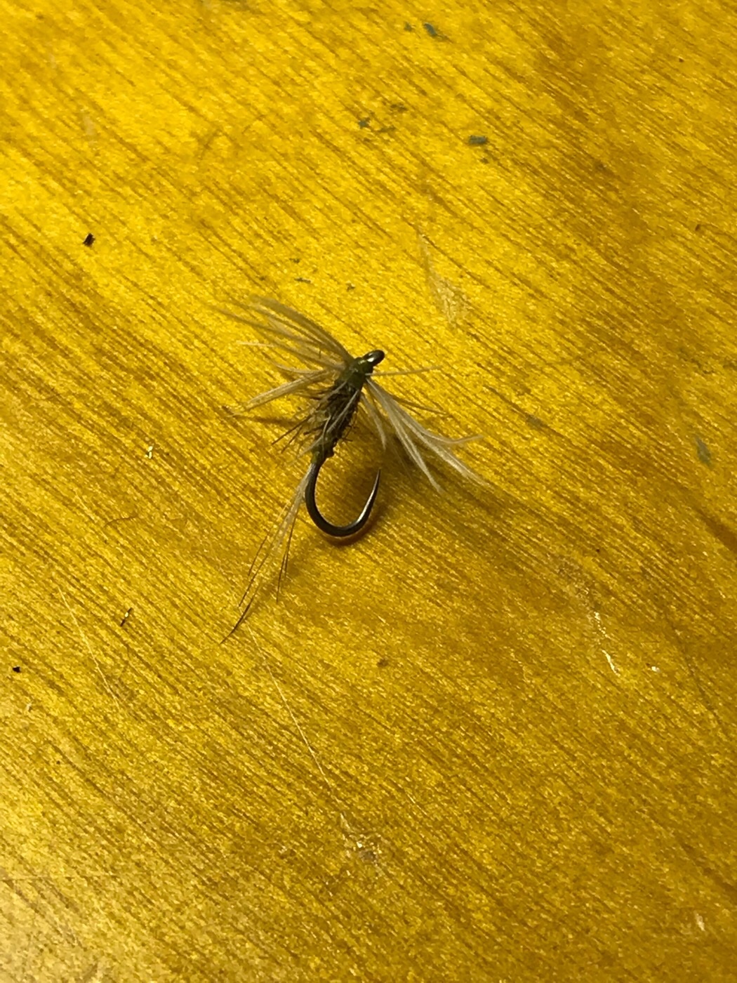 Dun rooster for tail, olive tying thread for body “ribbed” with hares ear in a waxed dubbing loop, dun hen hackle. Dark cobblers wax to dull the effect of the rather bright olive thread I had at hand.