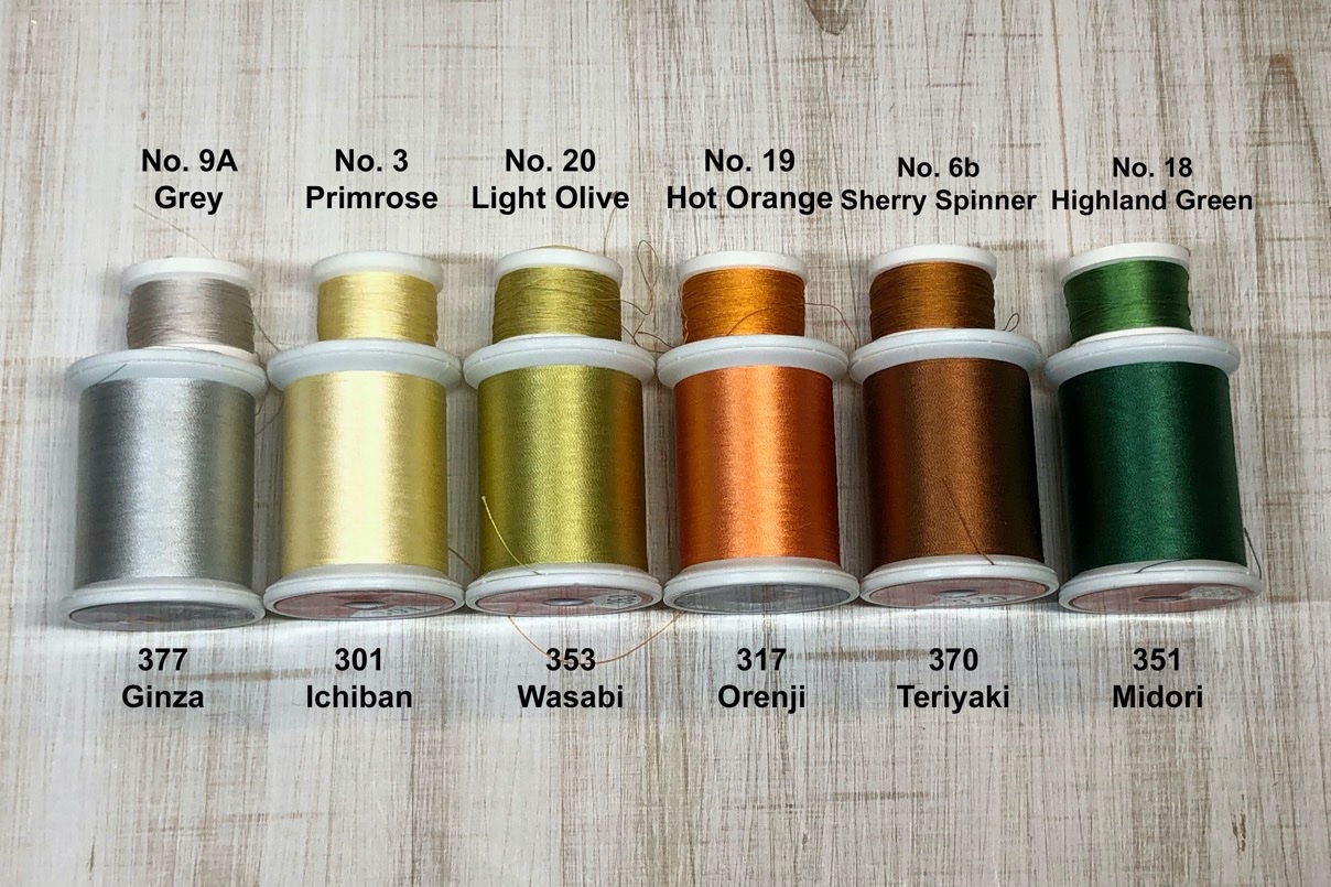 Just some numbers I've worked out for Kimono and Pearsall's. There are also some other colors of Kimono that I really like that are not available in Pearsall's. I started tying with the Kimono when Pearsall's fell. I really like it. It is smaller in diameter to Pearsall's which is great for those #16-#20's. Mind you, my normal tying thread is Griffith's 14/0 so this feels very comfortable to me. I've had no breakage issues with the Kimono silk. It has some great colors that are damn close to Pearsall's. It's hard to photograph and compare side by side because the diameter difference does effect the photography. the biggest downside to the Kimono is the large spools. They won't fit a standard bobbin holder you will need to manipulate a large bobbin holder to make them fit. Anyway this may save some time if you want to try some.