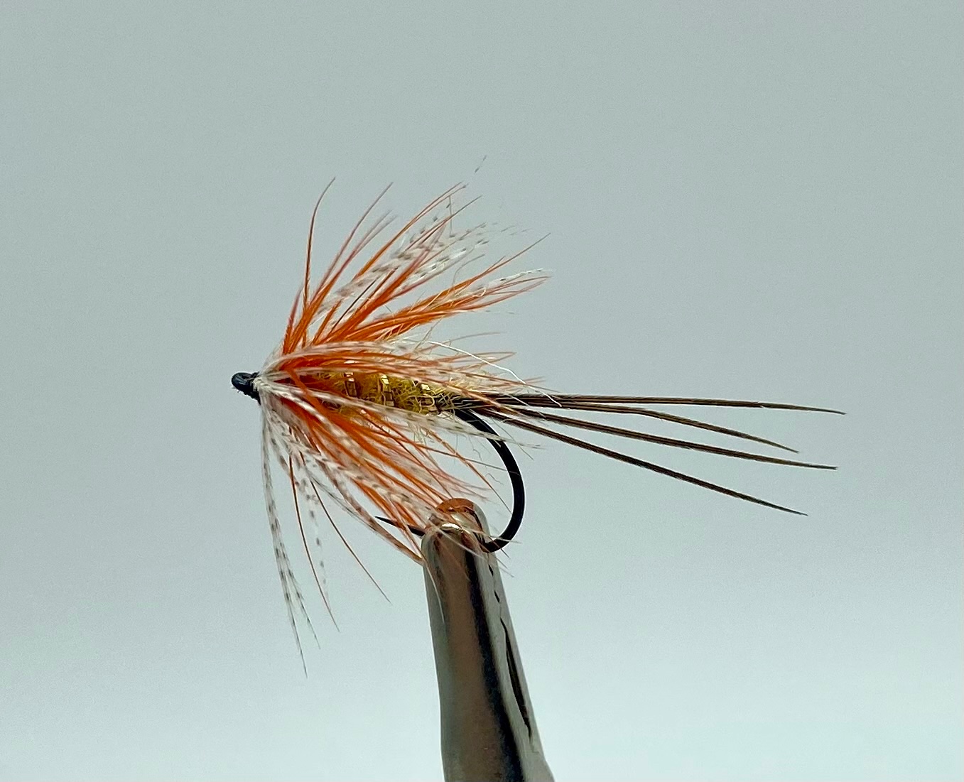 NS TriLobal Antron amber spun in 6/0 UNI black thread on a Clark Block. Rib is gold medium French oval tinsel. Tail is Pheasant Tail. Hackle is Orange Hen and Mallard flank.