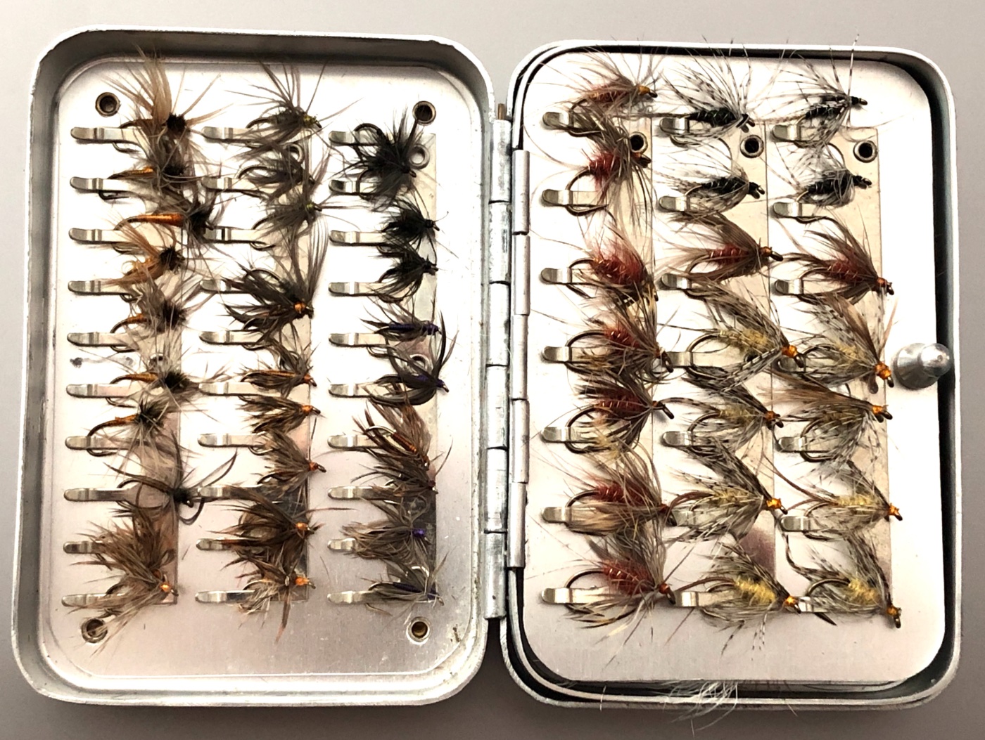 I couldn't find the small, leaf style Wheatley clip boxes Stateside, so a couple months ago, I ordered two more boxes that I filled up with spiders and soft hackles.