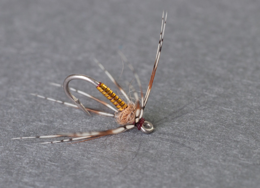 Abdomen: thread over wrapped with Sulky Sliver thread, brass/gold